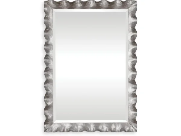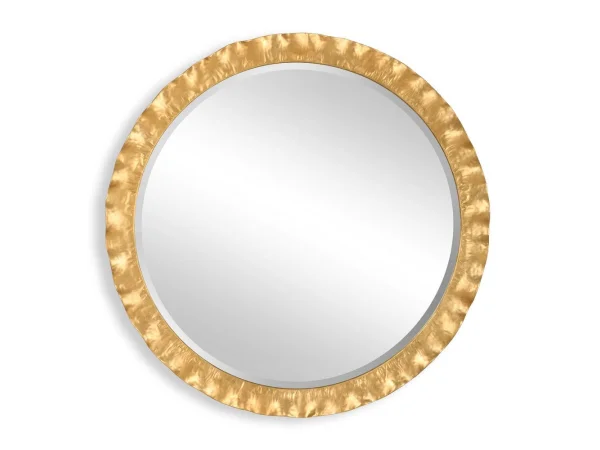 This mirror features a hand forged metal frame finished in a lightly antiqued gold leaf with an organic, scalloped edge design. A generous 1″ bevel is added to this piece, which may be hung horizontal or vertical.