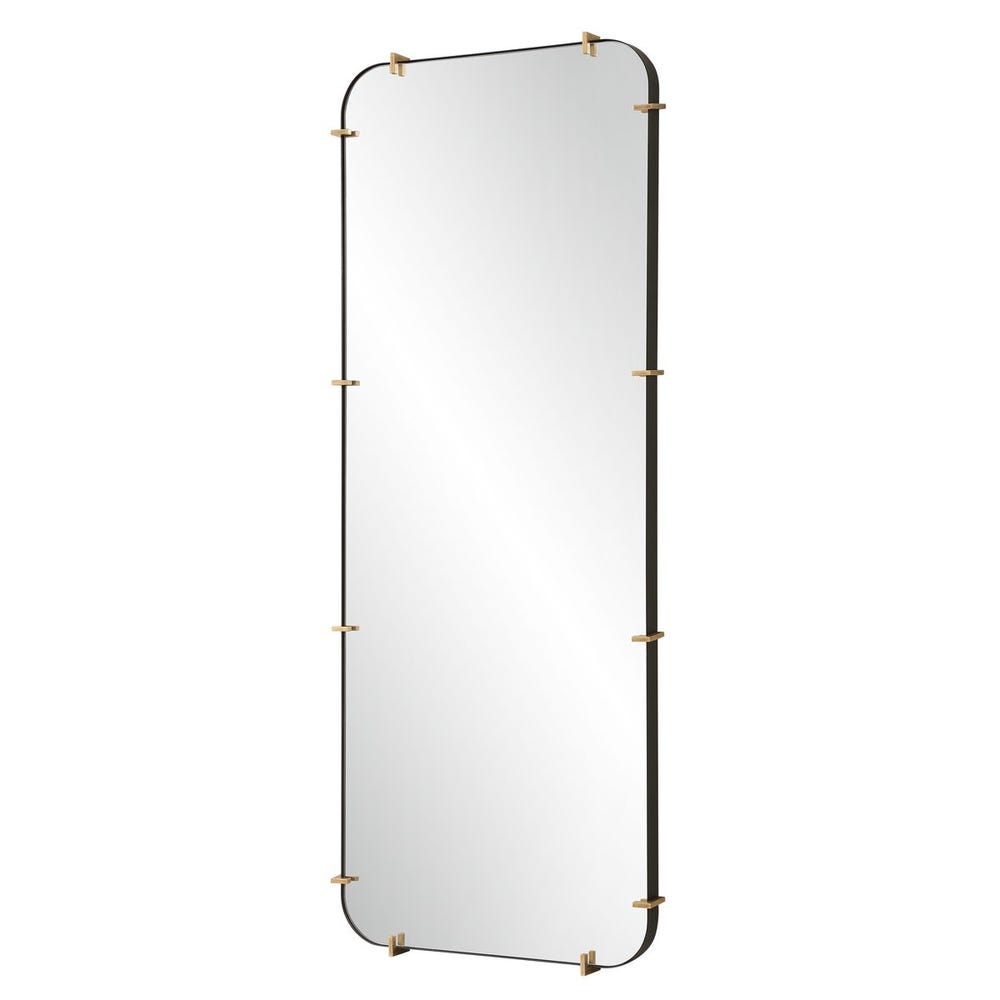 The Pali Round Mirror successfully pairs contemporary and industrial styles with a black iron strap frame accented by lightly antiqued brushed gold details, surrounding a floating polished edge mirror.