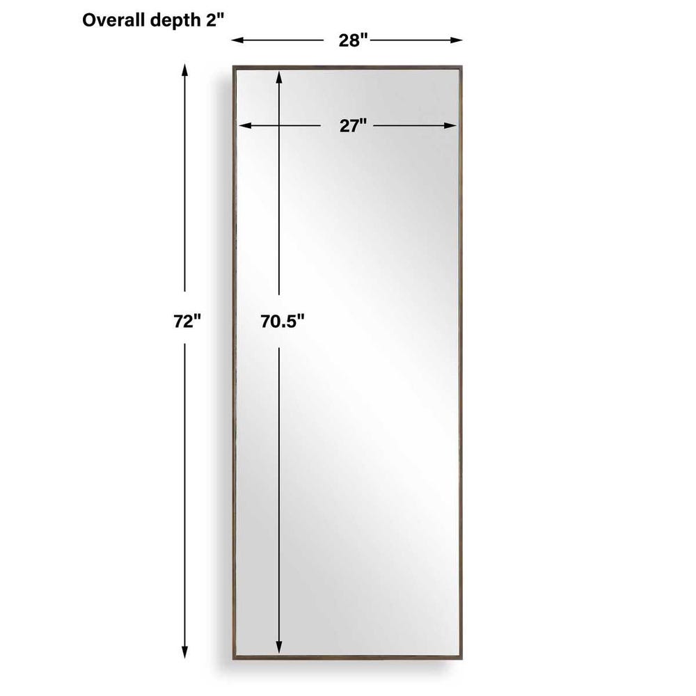 This sophisticated dressing mirror features an oxidized antiqued bronze finish on a clean, linear iron frame. May be hung horizontal or vertical.