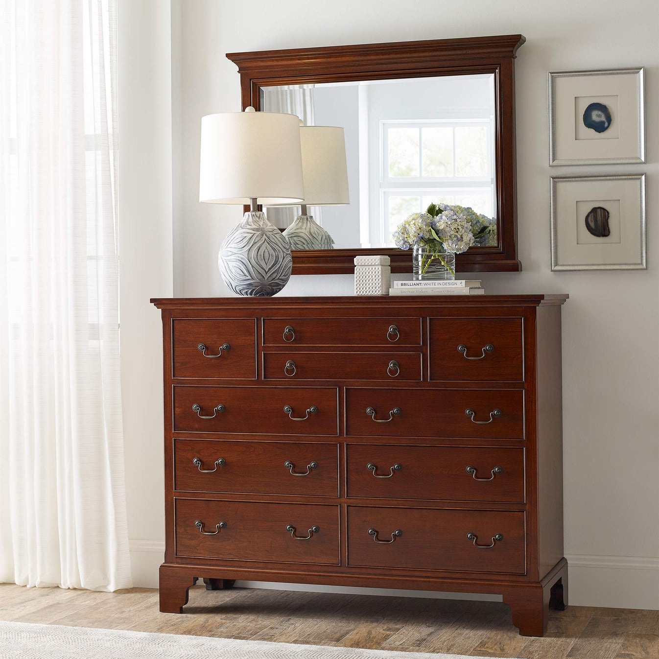This beveled mirror with precisely chamfered corners makes a beautiful partner for the Wayside Inn Triple and Master Dressers. Solid cherry in a Wayside Cherry finish that has light physical distressing and cow-tailing antiquing.