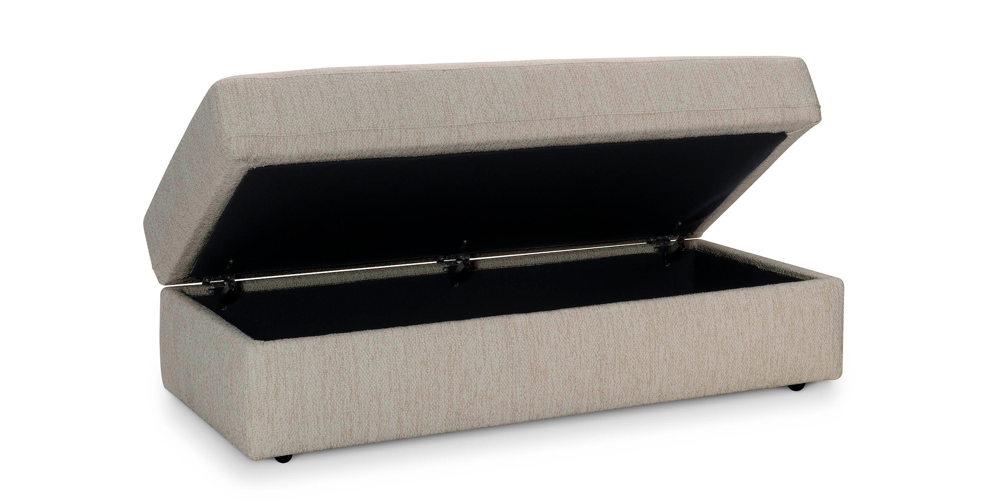 What will you store in your large and comfy Allure storage ottoman? Blankets, games, craft supplies? The sturdy hinges make it easy to quickly stash things away before guests arrive, and casters allow you to easily reposition the ottoman for an extra seat. Available in our best price fabrics, Alabaster Revolution Dreamy and Dove Revolution Dreamy fabric. Want more options? Customize your own with over 600+ fabrics!