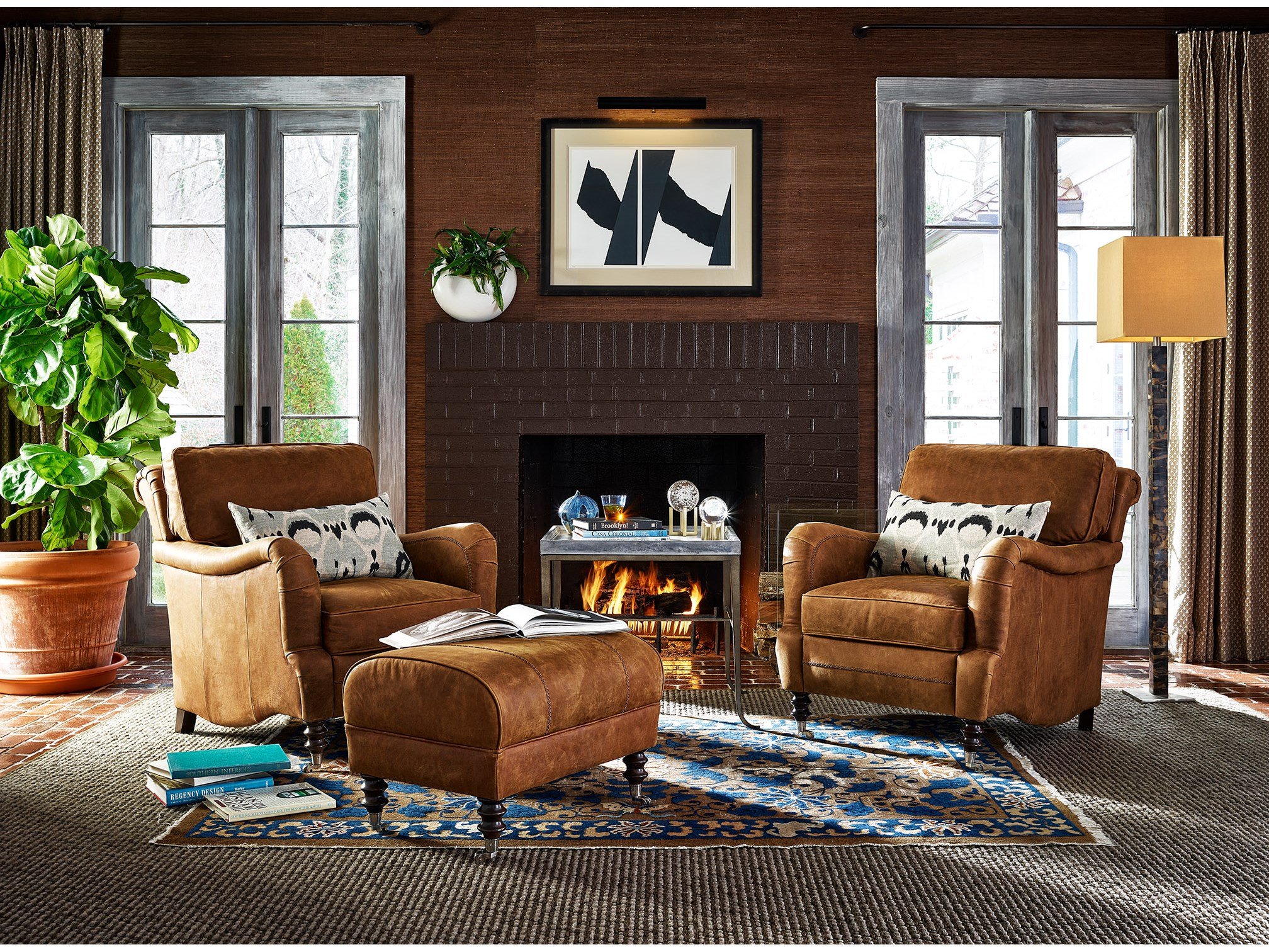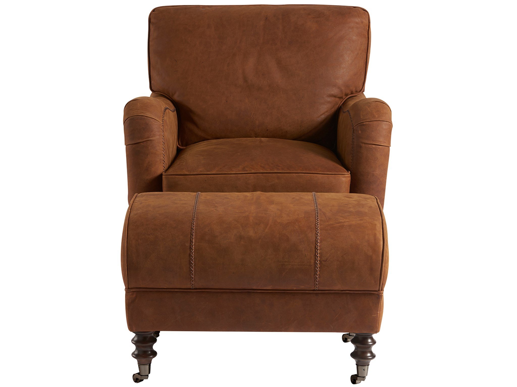 The Brice Ottoman stands elegantly on its own or paired with the Brice Accent Chair, upholstered in a luxurious Chestnut leather fabric and finished with subtly detailed legs with casters.