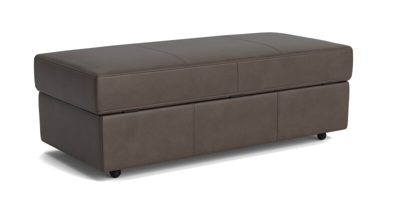 Leather storage ottoman on casters offers extra seating and a flat surface, with easy-access interior storage. 52 in. W x 24 in. D x 19 in. H.
