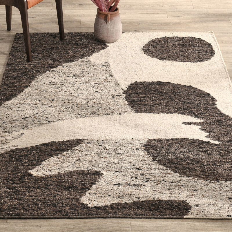 Full of visual energy, this handwoven rug features a modern abstract pattern accentuated with rich texture and contrast. Hand-carded wool fabric gives this artisanal rug a lofty look and feel, while also imparting a variegated tonal effect that complements most palettes. Wool ensures lasting durability while also making this rug an eco-friendly, sustainable choice.