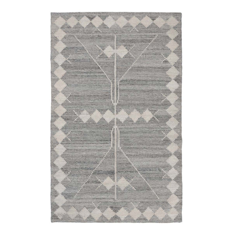 Framed by diamonds, this chic gray rug features an abstract geometric pattern in soft, neutral hues. Elevate any indoor or outdoor setting with the versatile beauty of this rug. Handwoven from polyester yarn, this rug effortlessly blends durability with timeless style.