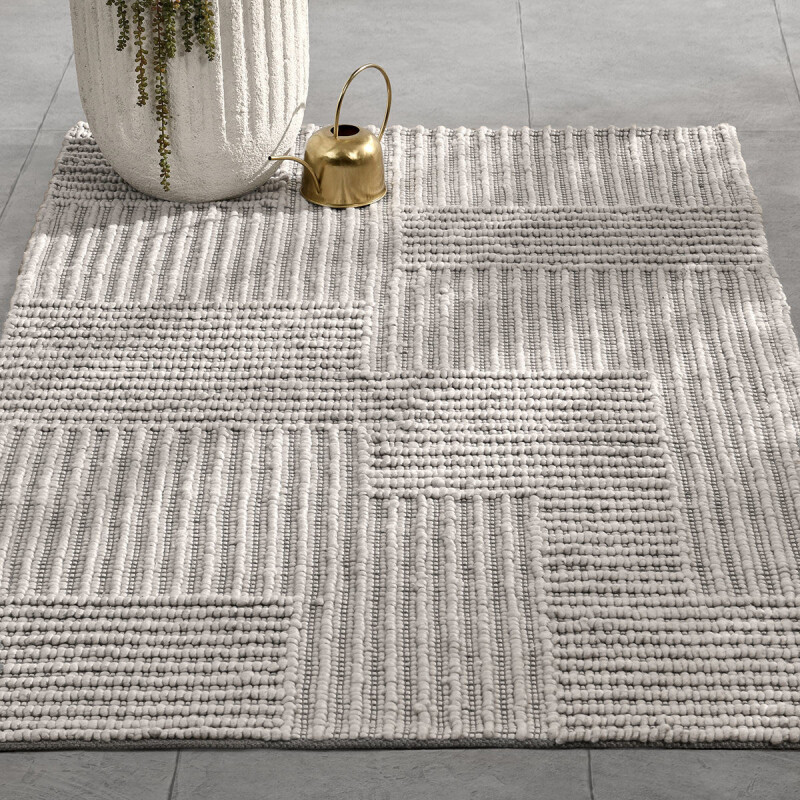 Featuring single-use plastic transformed into soft yarn, this handwoven neutral colored rug brings dimension and a contemporary, geometric element to any indoor or outdoor space.