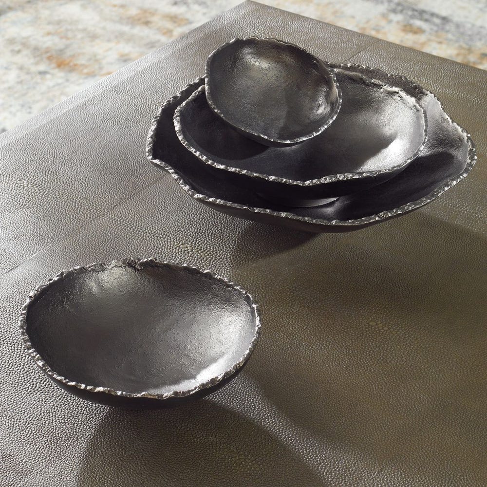 Handcrafted from aluminum, these outdoor metal wall bowls feature noticeable textural elements with organic edge details and are finished in matte white. May be hung on a wall with keyhole hangers, or displayed as tabletop accessories. Sizes: Sm-5x5x1, Med-7x7x2, Lg-9x9x2, XL-11x11x3