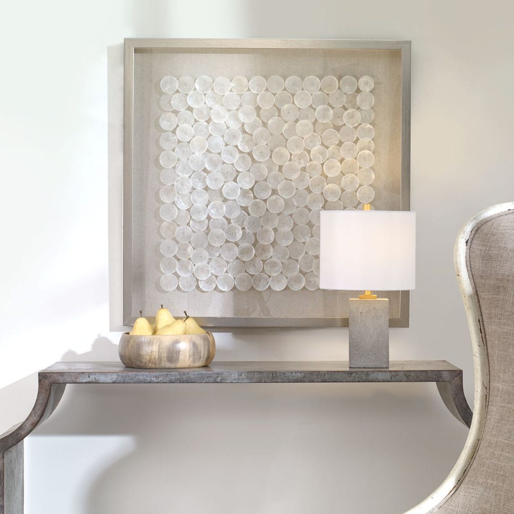 Known as the Windowpane Oyster for it’s transparent qualities, the natural layered capiz shells shimmer in this shadow box style wall piece. Placed over a flax toned linen backing in a pine wood frame finished in brushed silver.