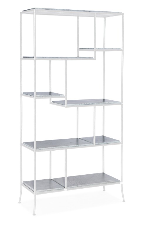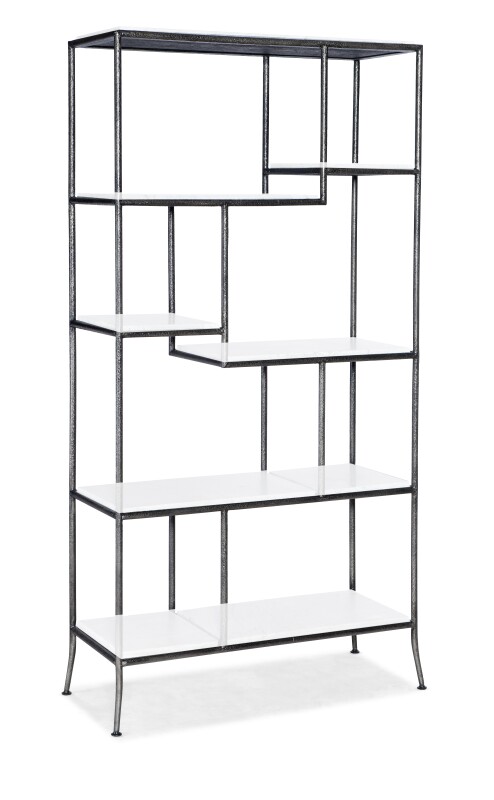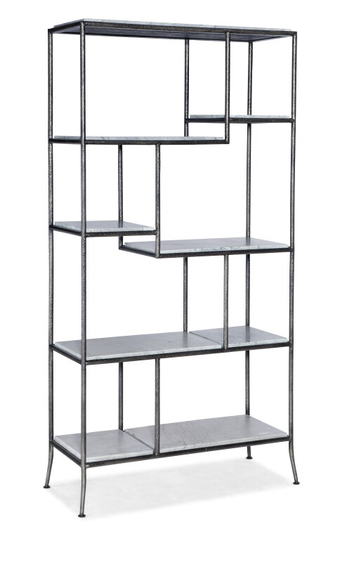 Symmetrical and stylish, the Commerce & Market Bookcase offers a serene silhouette for any space. This tactile piece is an eclectic blend of materials with a textured dark gray Carbon Steel metal frame and Blue Forest Stone shelves. Six fixed shelves.