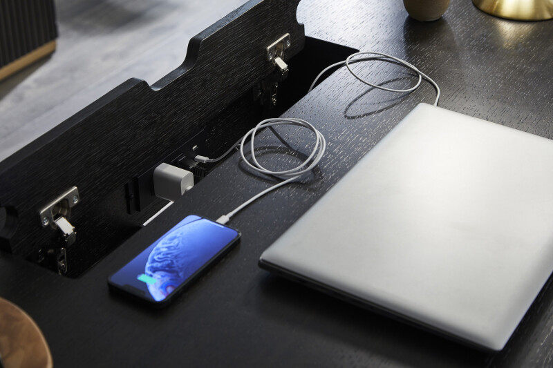 Charging Compartment | The charging compartment is conveniently located on the top of the desk. Contains 2 A/C and USB charging ports and features soft close hinges to keep fingers safe. |