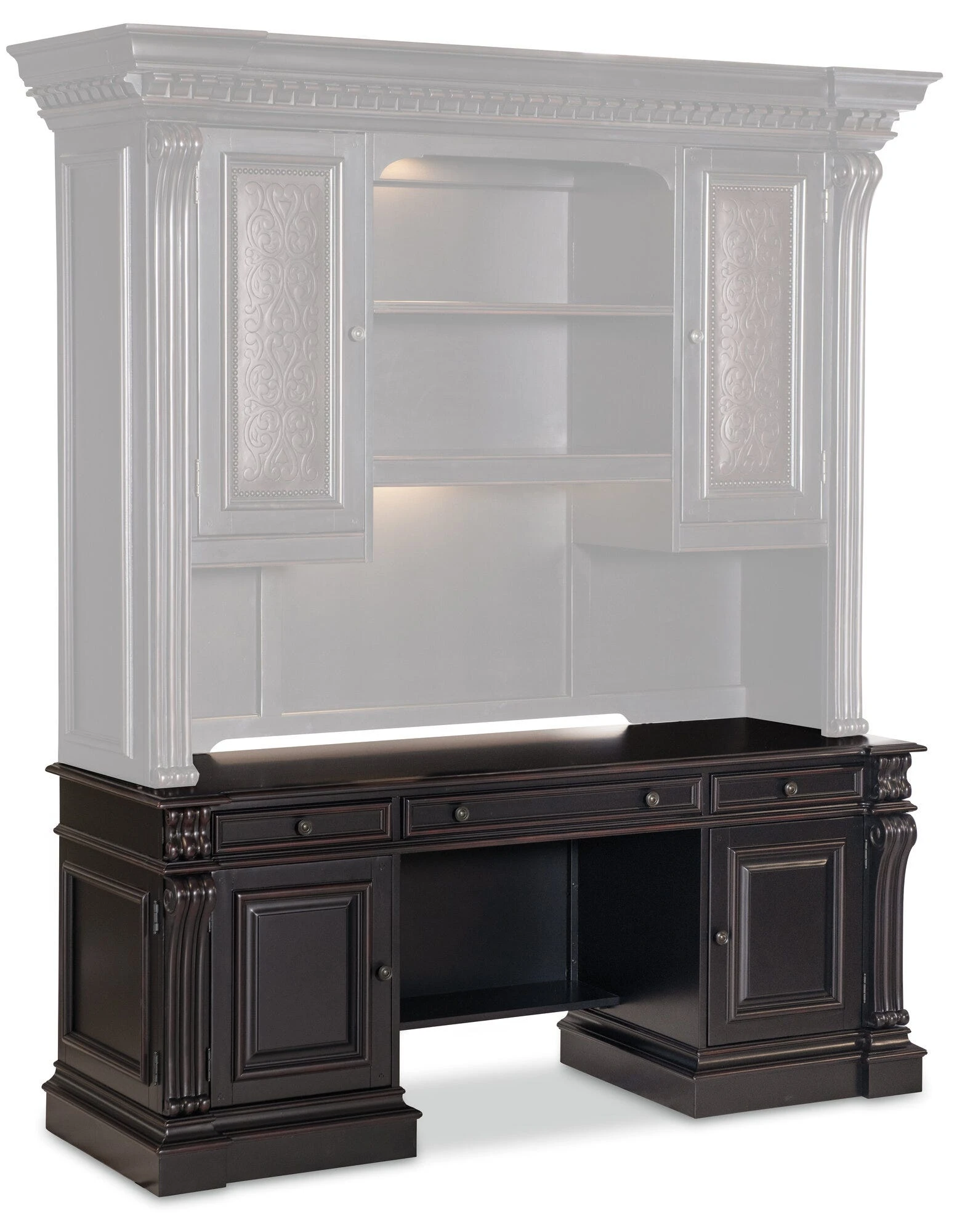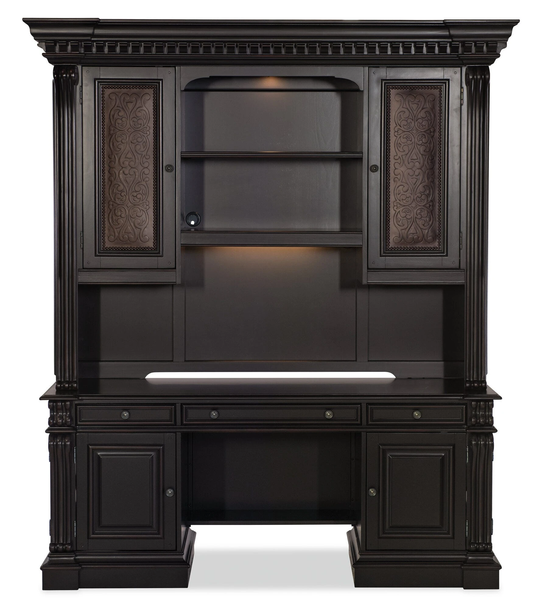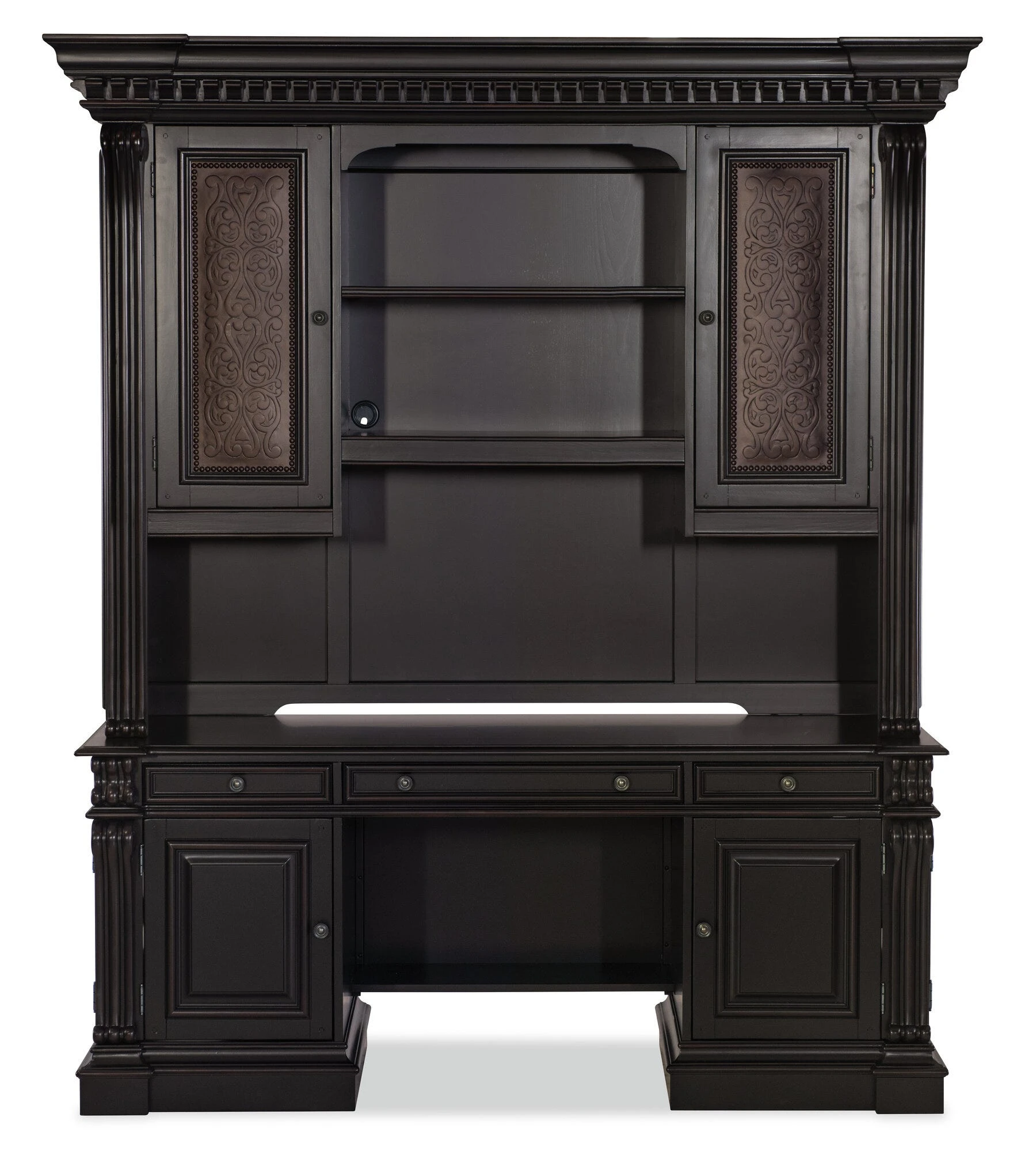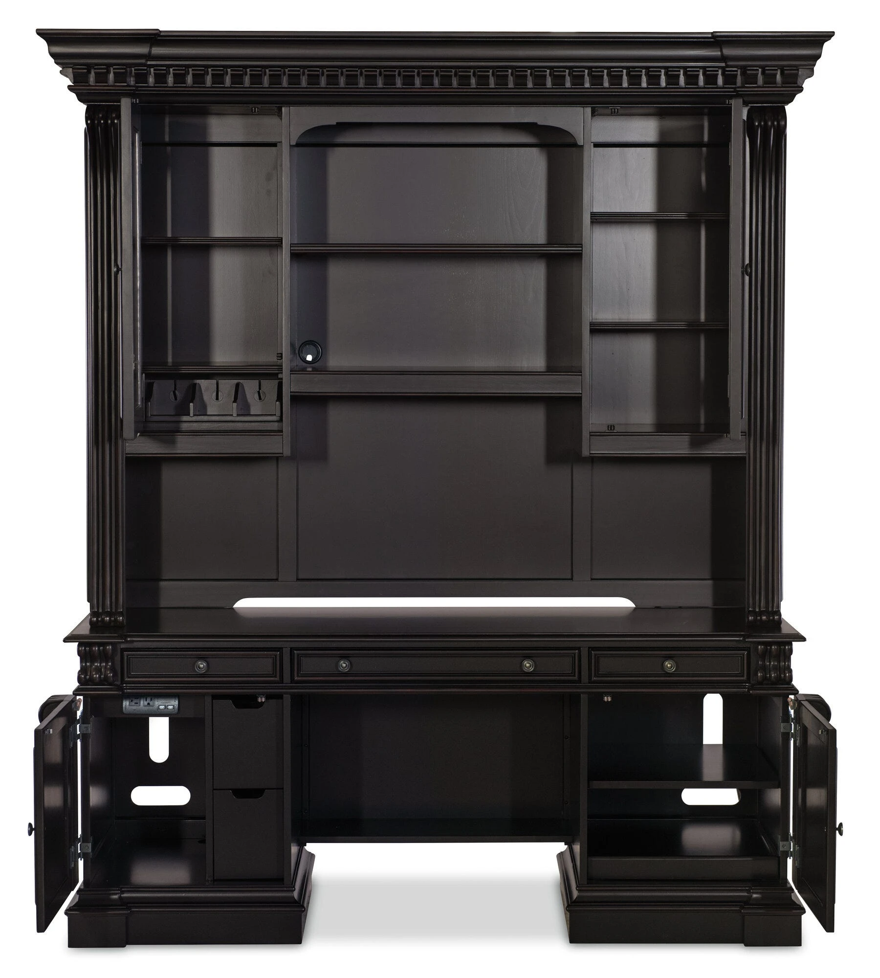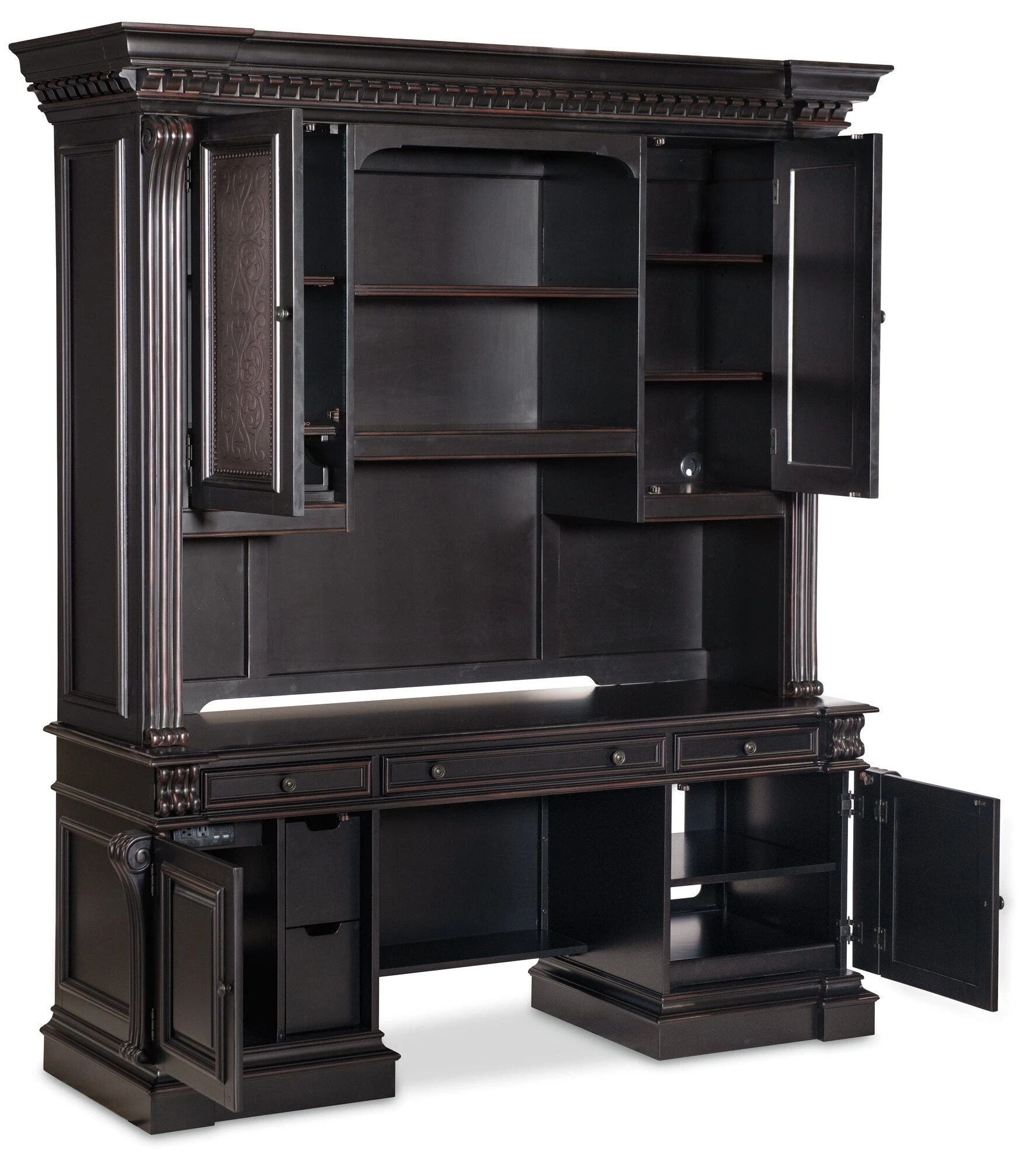 Computer credenza in a black finish with scroll‑motif trim, offering media storage drawers and a power supply. Includes a keyboard tray with document rest, removable partitions, utility drawers, and an adjustable shelf.