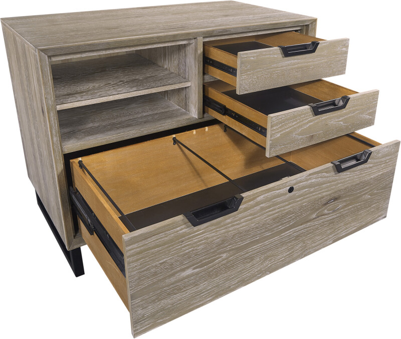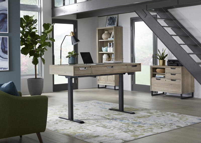 Offering a relaxed contemporary look from the complex organic finish to the contrasting metal accents and hardware. Functional features make this an easy choice for your workspaces.