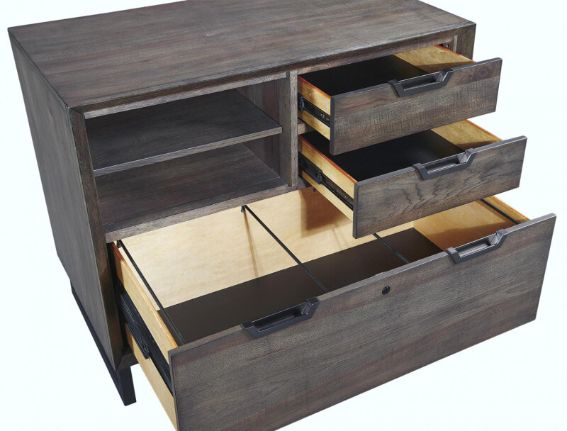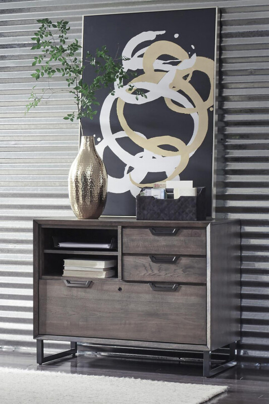 Offering a relaxed contemporary look from the complex organic finish to the contrasting metal accents and hardware. Functional features make this an easy choice for your workspaces.