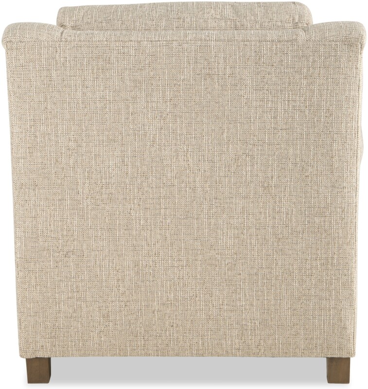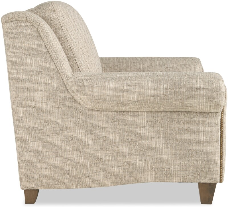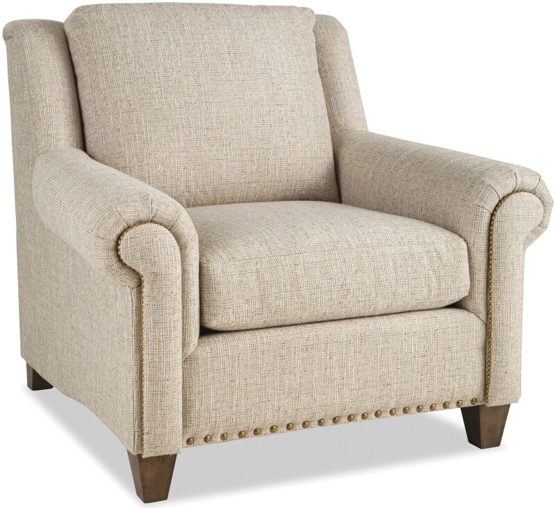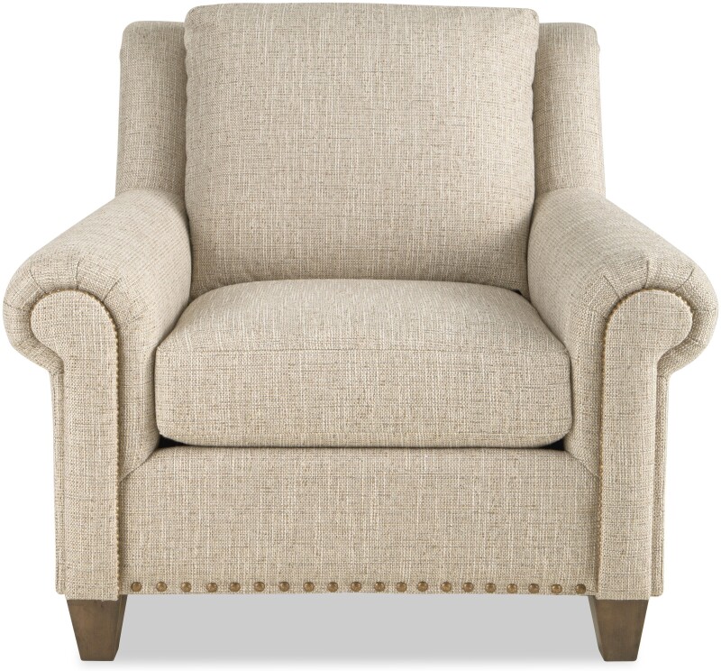 Time-honored details blend effortlessly with modern comfort to create this classic chair. It features beautiful accents like offset arm panels that are lined with nail head trim, and subtle wings that wrap you in comfort. The front rail is also trimmed in nail heads for another touch of craftsmanship. French seaming and tapered legs give a clean and elegant look. Comfort is key with plush cushioning and attached back pillow. Also available without nail head trim. Also available are the matching sofa, loveseat, and ottoman. See style 730950 for photo of the sofa.