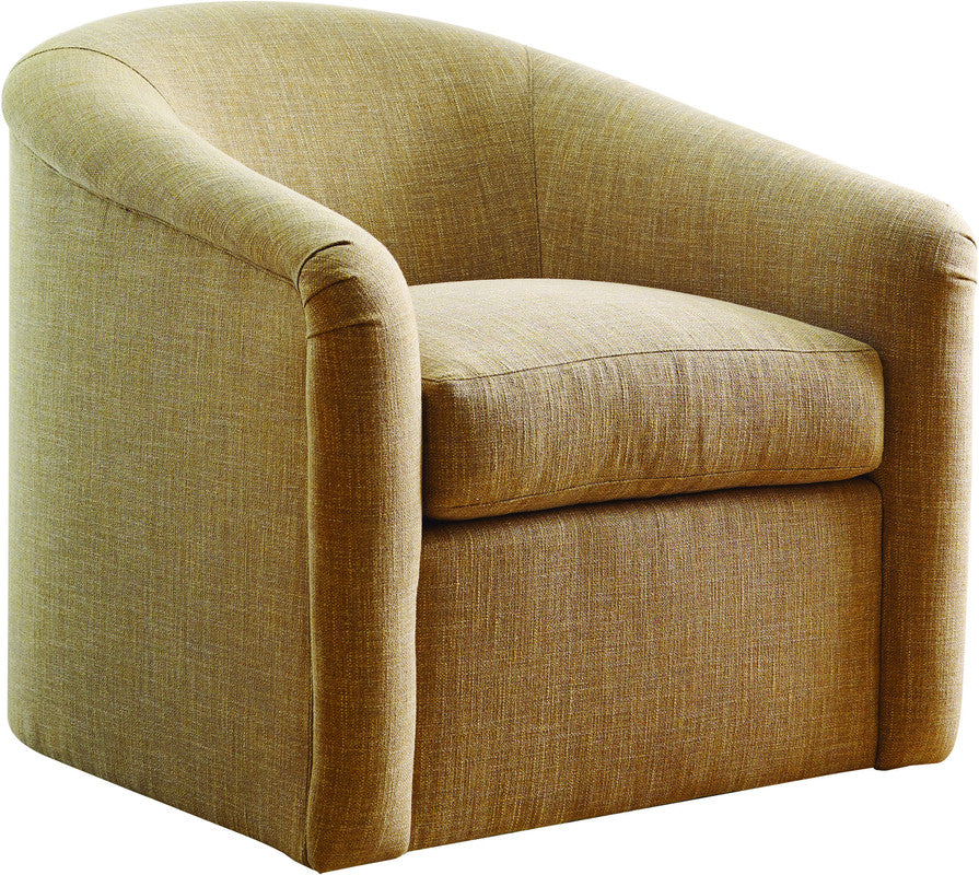 The attention-grabbing Berwyn Swivel Chair has a modern round shape that is as enveloping and comfortable as is looks. A thick, custom-shaped seat cushion is supported by eight-way hand-knotted springs, and the curved arms and back can be outlined with optional nailhead trim. Available in fabric or leather.