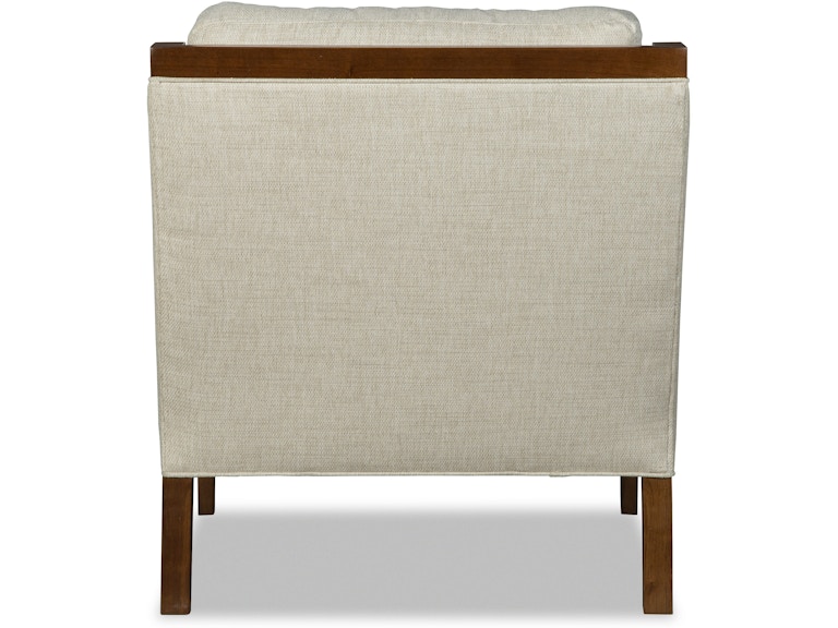 This handsome wood accent chair has a bold transitional style that elevates any setting. The wood frames the back rail and sloping arms, and then continues down to the slender front legs. A loose box border back pillow and single needle stitching keep the look clean and modern. Padded arm rests for comfort. Available in any finish.