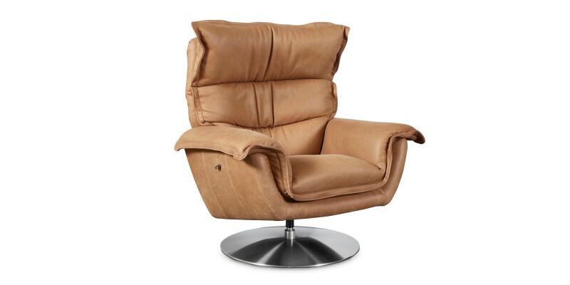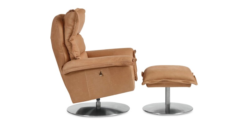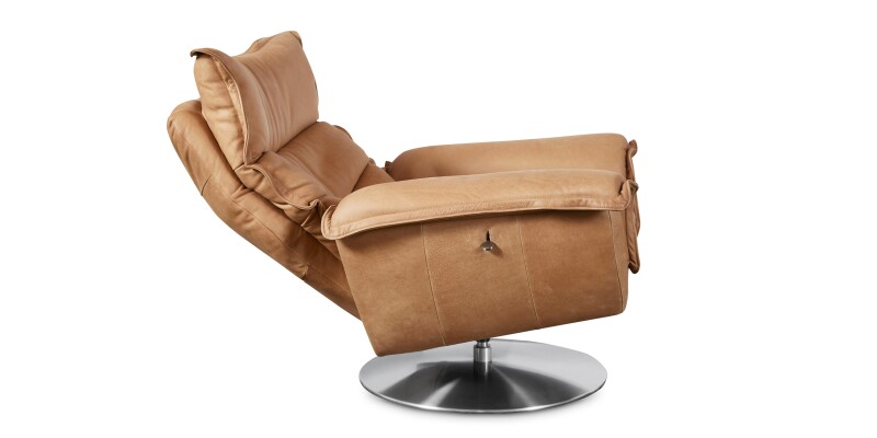 Leather swivel recliner with a side-lever variable recline and an adjustable headrest. Aniline-dyed full-grain upholstery and a 360-degree brushed stainless base deliver modern ergonomic comfort.