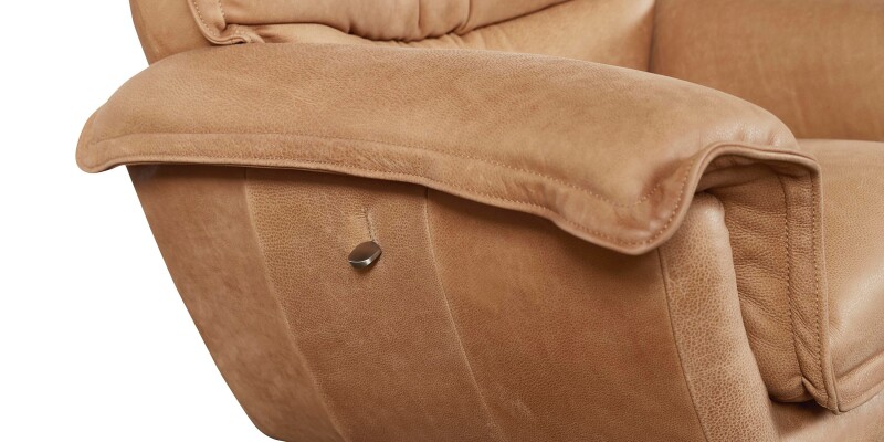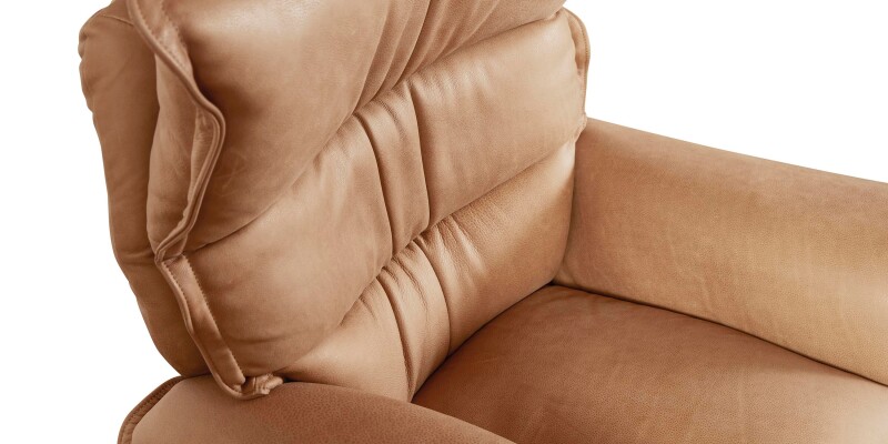 The new-century modern take on ergo reclining chairs is here – meet our Dunn Swivel Recliner! Upholstered in aniline-dyed full grain leather, the Dunn chair features horizontal back seams and flanged edges that maintain soft, modern lines while providing maximum comfort. A side lever operates the variable reclining mechanism and the headrest is manually adjustable, allowing you to set the chair precisely to your preferred position. When paired with its matching ottoman, also in your choice of Tan, Graphite or Chocolate leather, your relaxation is both chic and complete. About 14” of clearance is needed behind the chair to fully recline. The Brushed Stainless base of the chair swivels 360 degrees.