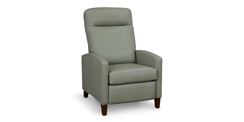 Leather lay-flat manual recliner with track arms, channeled headrest, and tapered wood legs for a clean accent-chair look. Optional tall back and power, USB port, and 30 in. W x 40 in. D x 42 in. H.