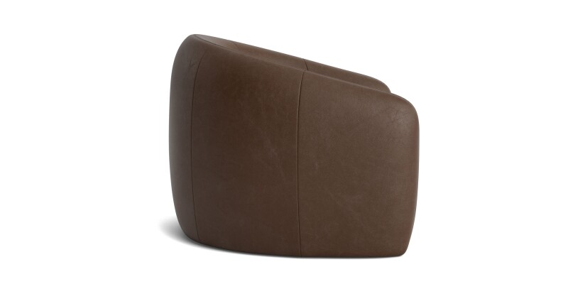 Leather barrel swivel chair with a curved back and wrap-around arms; plush contours and a smooth swivel base encourage easy conversation.
