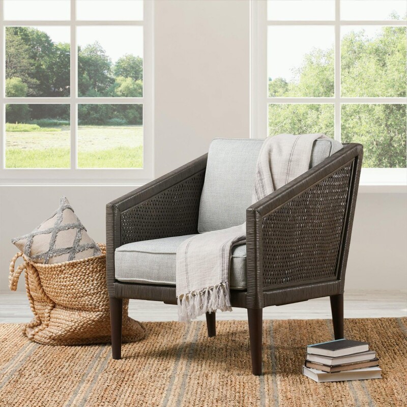The Kaitlin Accent Chair combines natural materials with modern design for a chic, laid-back aesthetic. Crafted with a sturdy angular frame, this chair features a blend of wicker and rattan, offering texture and durability. Removable cushions provide added comfort and easy maintenance, making the Kaitlin a versatile and stylish addition to any living space.