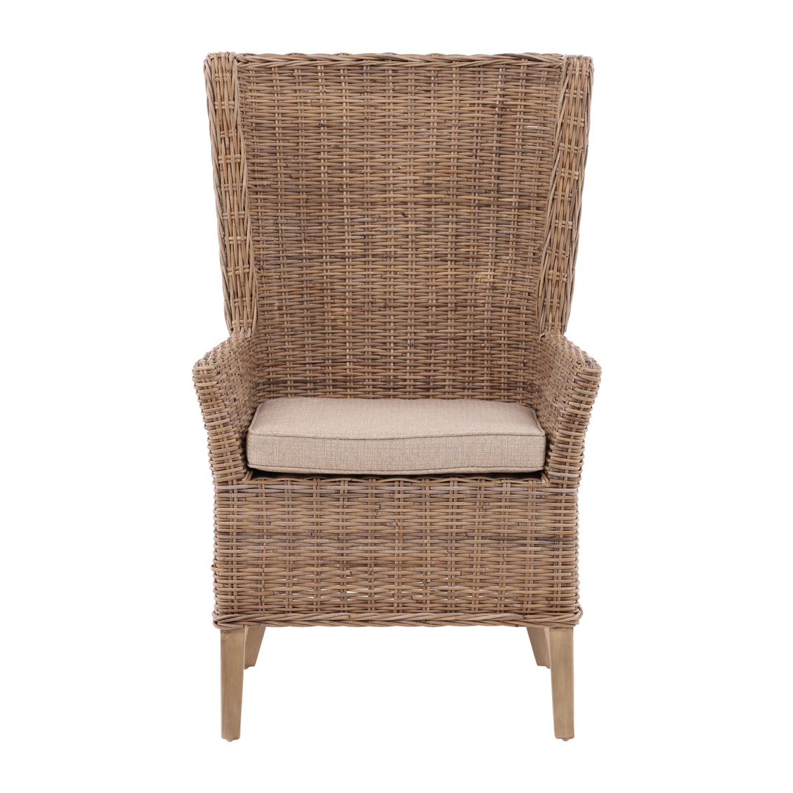Reminiscent of a formal wing chair, but given a sense of Key Largo sunshine. Created in woven kubu over a plantation grown mahogany frame, this host chair comes with the comfy linen seat. Relax and enjoy hosting in this beautiful chair.