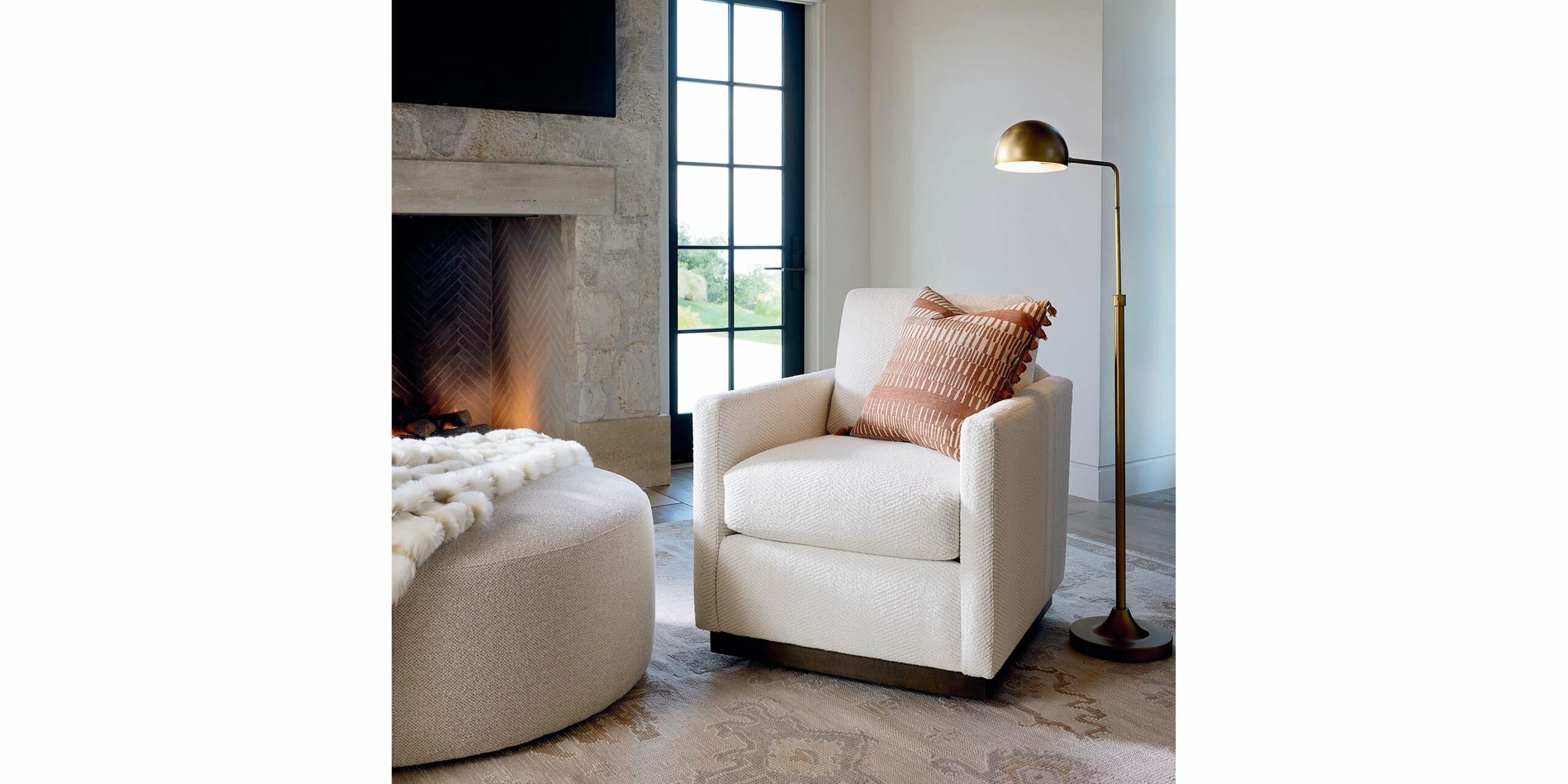 The Myles swivel Chairs features a sleek and contemporary wooden base. Cushion options are available and include lounge and support. Available in fabric or leather. Choice of finish is available on the base. This chair is only available as a swivel. The seat construction is sinuous wire. If selected in-store, the nail head trim will be a small size (3/8″) and will be placed end to end along the base of the chair.