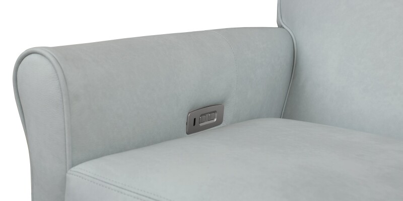 Leather lay flat power recliner with classic sock arms and a USB port, customizable for leather, cushion comfort, and wood leg finish.