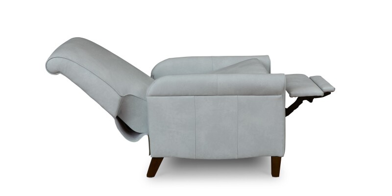 Leather lay flat power recliner with classic sock arms and a USB port, customizable for leather, cushion comfort, and wood leg finish.