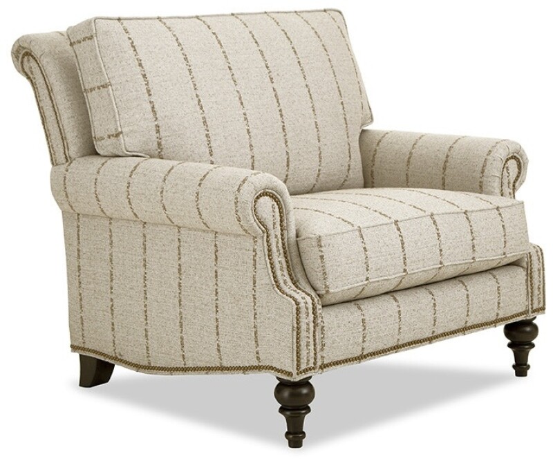 Classic traditional details and nail head trim accents are the things you’ll notice first on this gracefully finessed chair 1/2. It features a rollover back, cut-back rolled arms, and beautifully turned legs that offer a familiar heirloom touch. Attached box border back pillow. Optional nail finishes available. Also available is the matching sofa, loveseat, and ottoman. Also available without nail head trim.