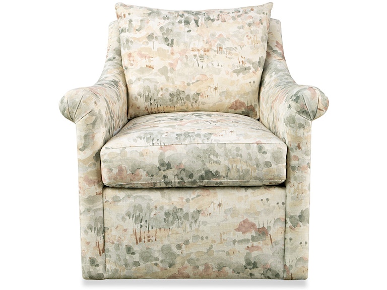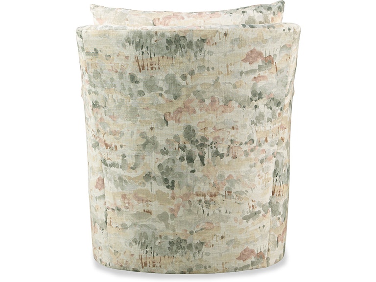 Understated and elegant, this swivel chair is beauty defined. It features slender sloping arms that taper from back to front and is finished with a pleated detail on the face. French seamed overall with a knife-edge bed-pillow style back pillow. Blend Down seat cushion.