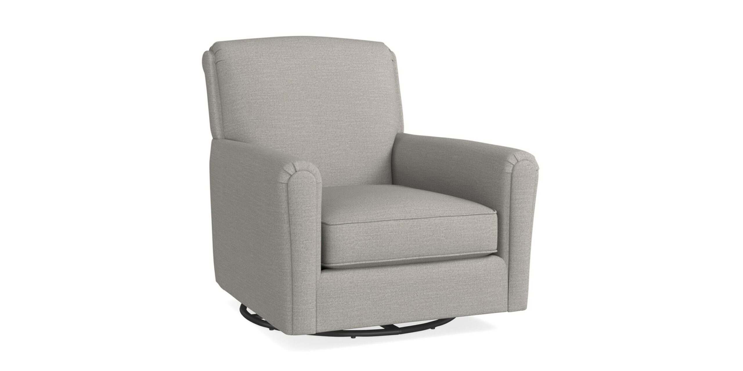The perfect arm chair for small spaces. Pair two chairs together to create a conversation space. The Ridgebury Swivel Glider combines simple styling with ultra seating comfort. This chair features slightly gathered, Charles of London arms, a shaped pub-style back, welted seat cushion, and tapered front legs. Also available in leather. Available online in 185 different fabrics and 67 leathers.