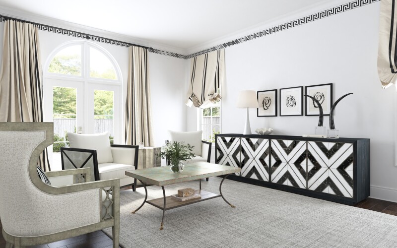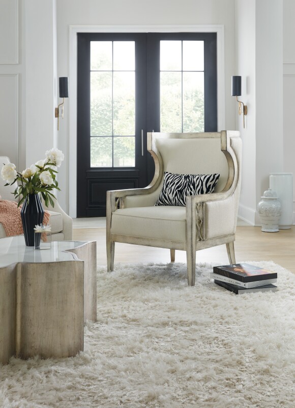 She’s a modern gal: up to date and sumptuously scaled. The Sanctuary Debutant Wing Chair has a classic pedigree in historic traditional and has been streamlined and modernized. A true style statement, the Debutant shows off three different performance fabrics: The inside back and seat is in Celestial Ice, and the outside back is in Sequins Pearl, while the pillow is in a zebra print for extra fun.