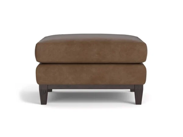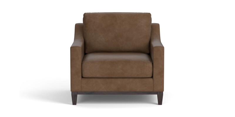 Leather accent chair with slope arms and a high wood-edged base, offering a deep, comfortable seat in top grain, aniline-dyed leather. Removable back cushions.