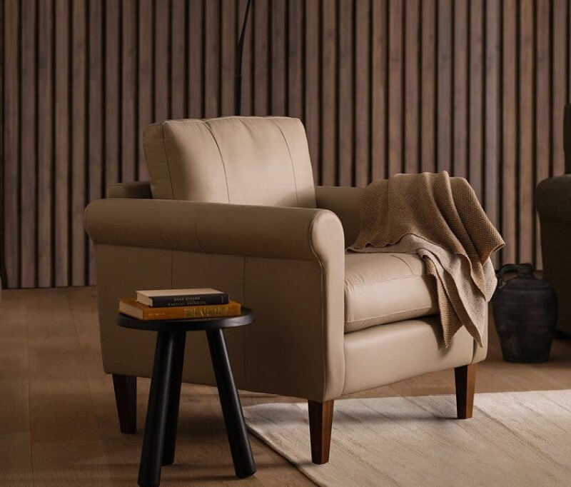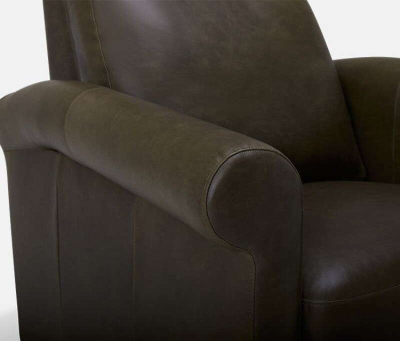 Soren Roll Arm features luxurious memory foam seats, complemented by high legs in a cognac finish, with a design that still feels approachable yet slightly more formal with its roll arm.