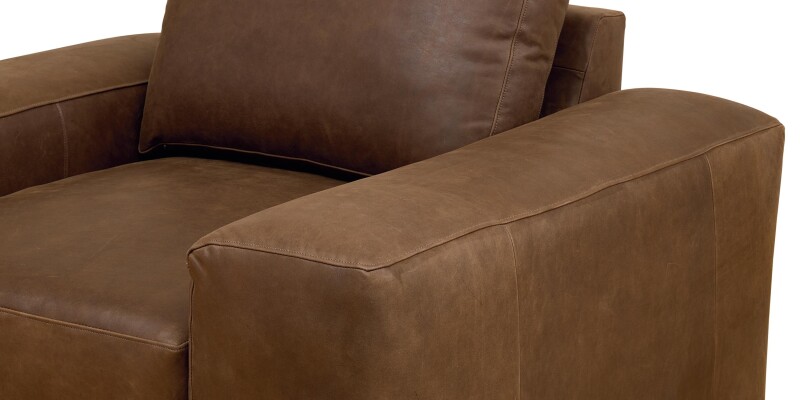 Low-profile leather chair with wide track arms and deep seating for relaxed lounging. Loose, removable back cushions and thick padding add lasting comfort.