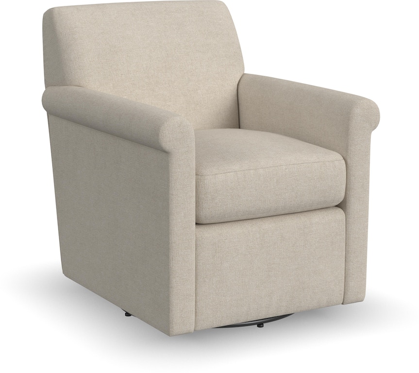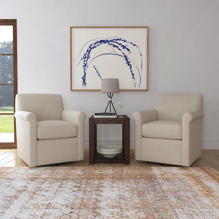 The perfect elegant piece to accentuate your home, the picturesque petite roll arms of the Stella swivel chair invite you in. Take a seat atop a removable and reversible cushion that is supported by our patented Blue Steel Spring system – backed by our lifetime guarantee. Handcrafted with a durable frame and upholstered with careful detail, Stella is designed to last. The tight back gives this quaint chair a modern flair, while the swivel base gives you freedom to move while lounging. Elevate your home with the chic style of Stella.