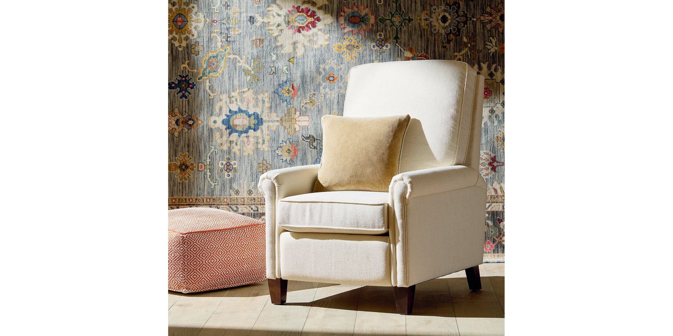 The sophisticated profile of this Thompson Chairs features gently rolled arms and tapered legs that complement the stately silhouette. This chair comfortably mixes with other styles thanks to its clean, updated lines and neat welt seams. Semi-attached back and loose seat cushion. Choose any one of 800 fabrics or 50 leathers, customize even more with nail head trim and leg finish in store. Also available as glider or recliner.