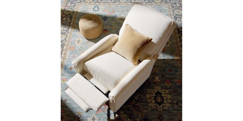 Manual push-back recliner with gently rolled panel arms and tapered legs, offering upright, TV, and full-recline positions. Fabric-upholstered and artisan crafted in the USA.