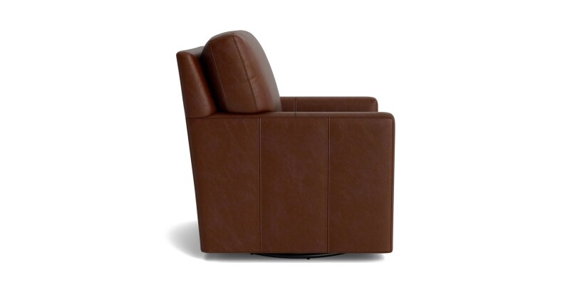 Leather swivel glider chair with attached back and seat cushions for consistent comfort. Topstitched box borders and tapered legs create a clean, timeless look.