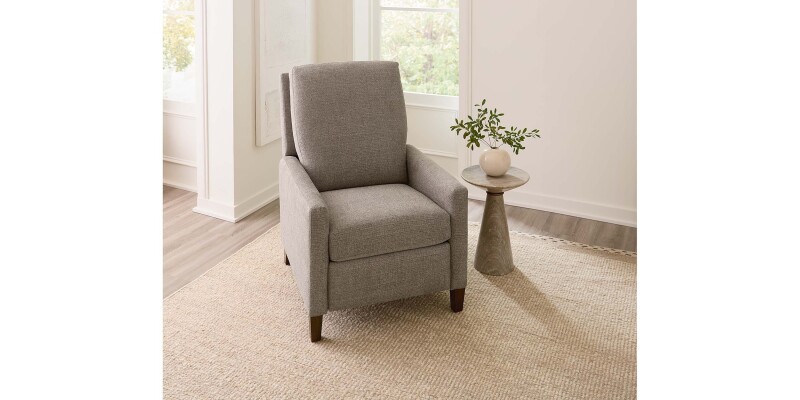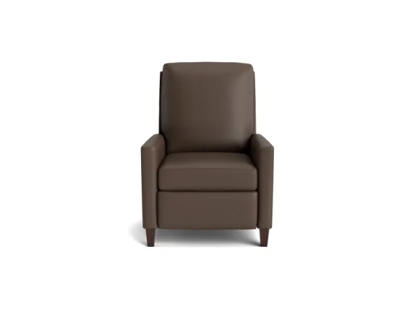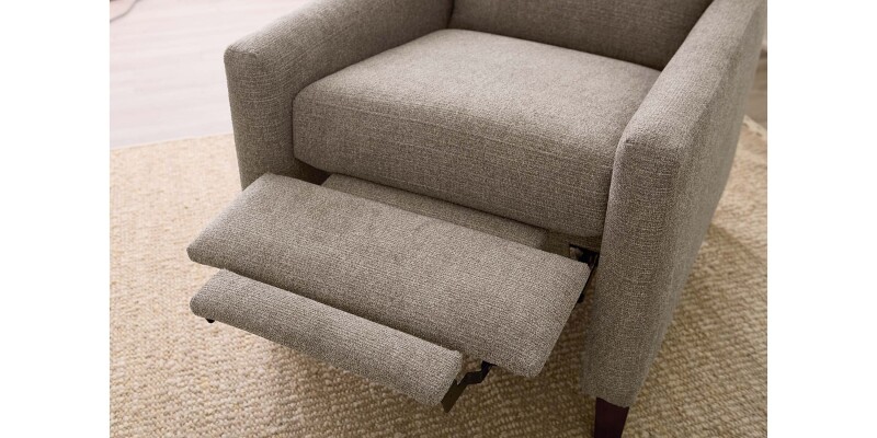 A contemporary power recliner on tapered wood legs with padded track arms, converting smoothly to two positions via an inside-arm control for easy comfort.
