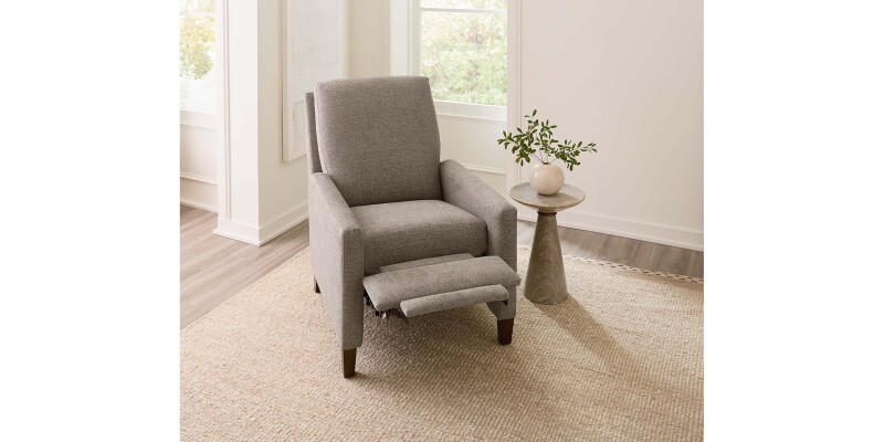 Compact power recliner with contemporary track arms, tapered wood legs, and fabric upholstery. Inside-arm control reclines smoothly for personalized comfort in a modestly scaled accent chair.