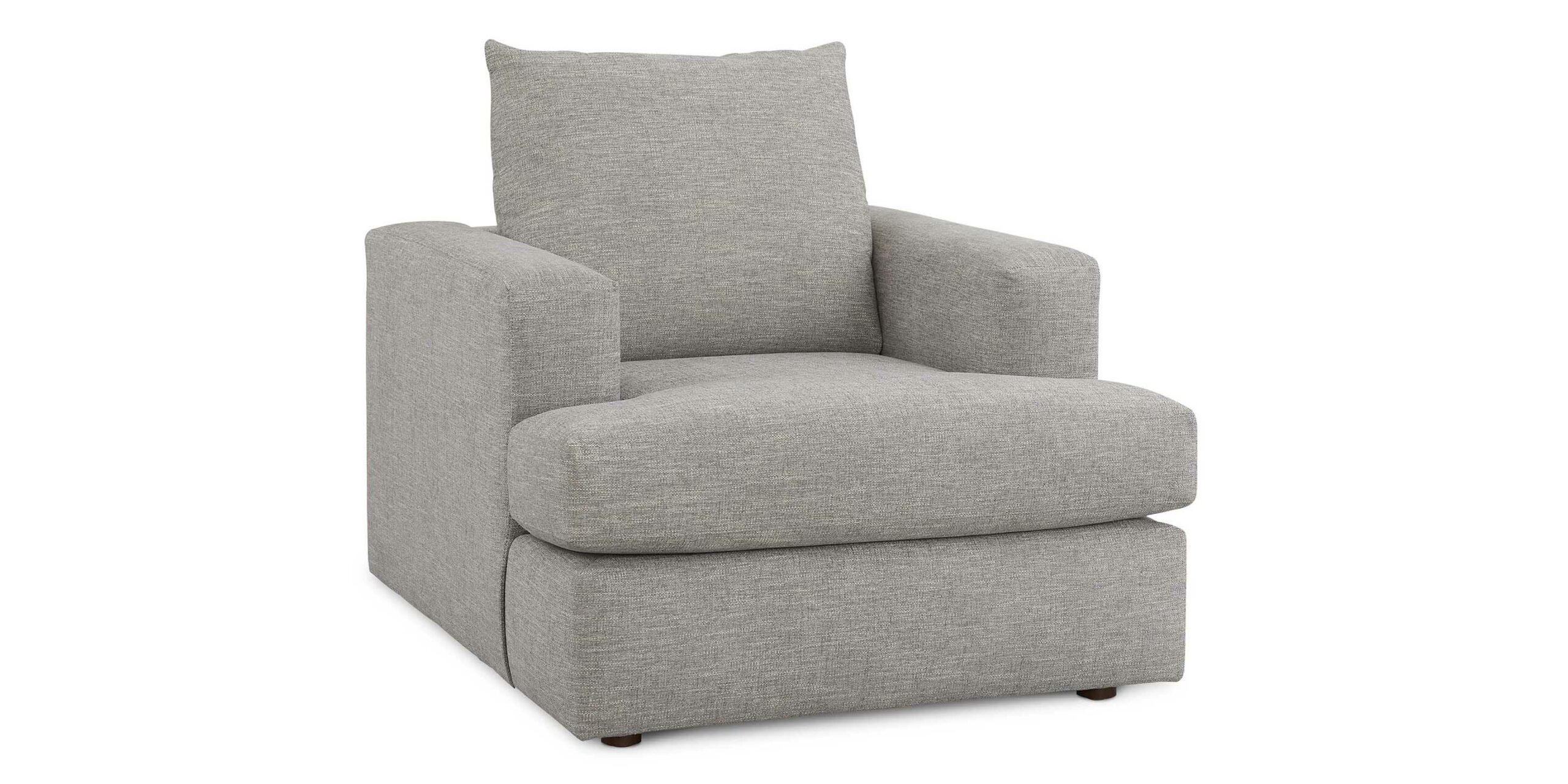 Easy does it! The Wilton Chair welcomes one and all with comfort and casual style. This deep chair’s distinctive recessed track arms and small round Walnut legs set it apart. Sink into the topstitched boxed seat cushions and lounge against the knife edge back. Choose from easy-care Pewter or Dove performance fabric.