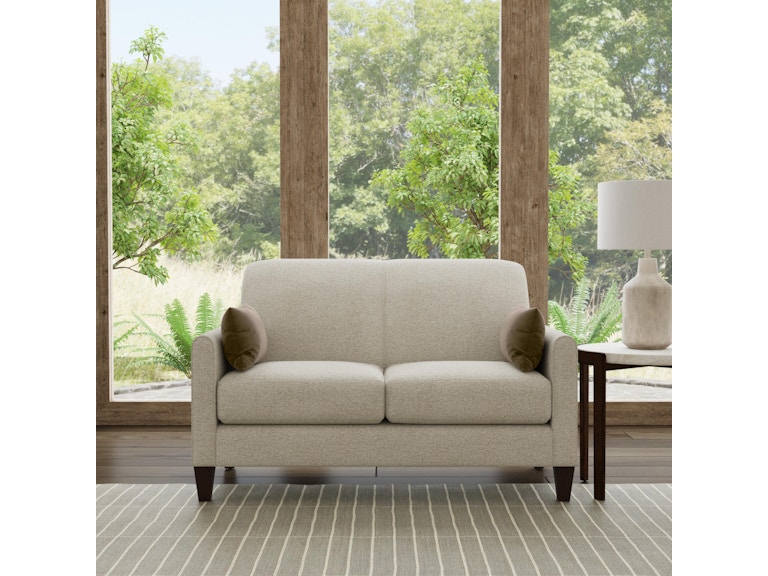 Add a touch of cosmopolitan allure to your living space with the Bond loveseat. Its sophisticated mid-century style delivers clean lines with a structured tight-back design and refined welt trim. Mailbox-style arms soften the silhouette, while lumbar accent pillows add style. Square tapered legs, available in three finishes, and the ability to upholster in your choice of fabrics ensures the perfect look.