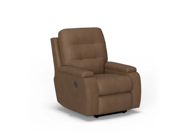 Kerrie should rest on a runway. It exudes the comfort, styling, and scale fitting of first-class seating on any airline. The recessed pad on the curved arm, the fully padded footrest, and the tufted back give Kerrie its superior comfort, support, and contemporary flair. A power reclining mechanism lets you change angles effortlessly from an upright to a fully reclined position with the touch of a button.