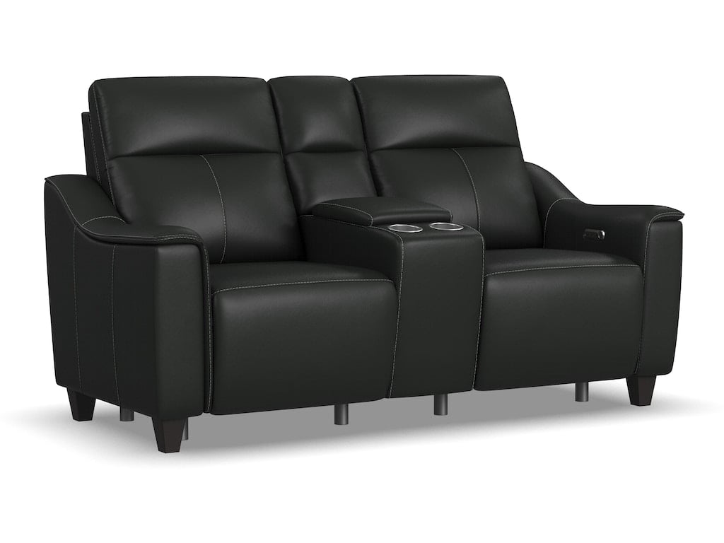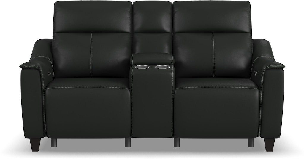 Alluring modern style merges with motion technology in the Walter power reclining loveseat with console. Featuring thin, pad-over sloped track arms, square tapered legs, and flat seats, Walter mirrors the look of high-end stationary furniture. Relaxation can be fine-tuned with an adjustable recline, powered headrests, and extended footrests, while high, divided backs support shoulders. Conveniently store drinks and remotes within reach and charge devices with built-in ports. Available in two colors of durable leather, this Walter power reclining loveseat is designed for lasting beauty.