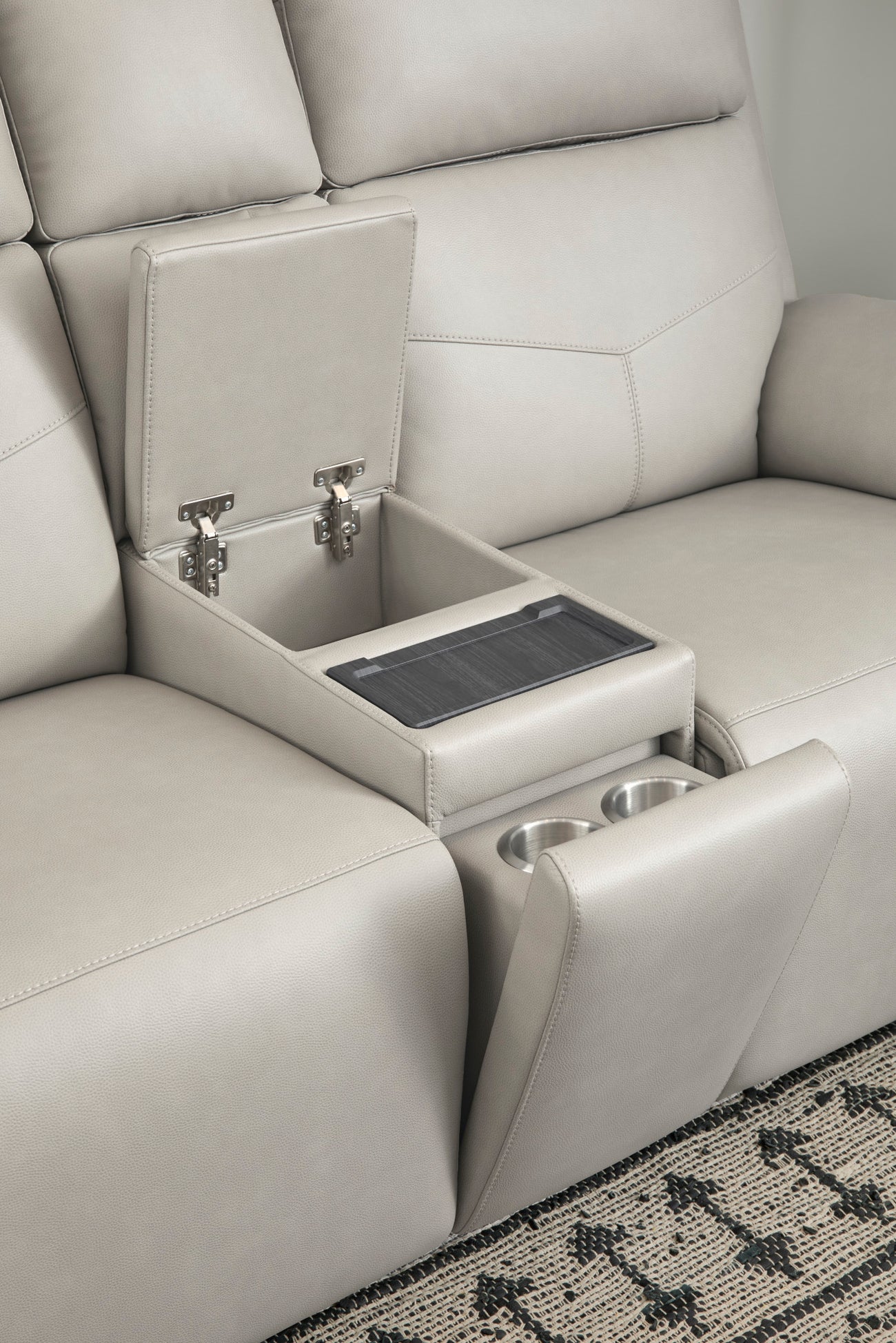 Vernon Dove Grey Fabric Power Reclining Loveseat with Console, Power Headrests, Lumbar, Heat & Massage