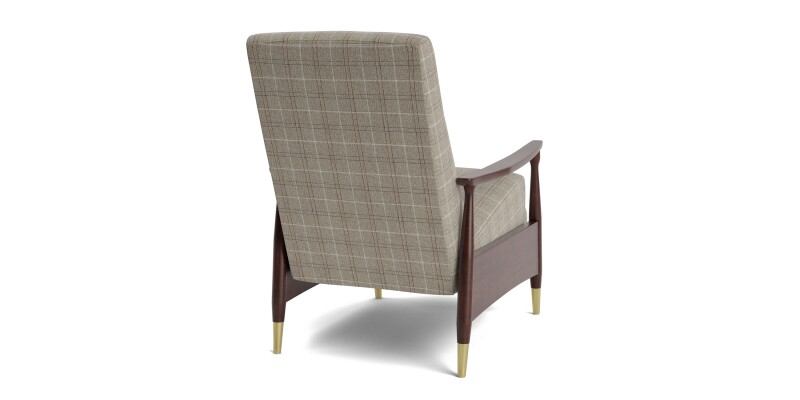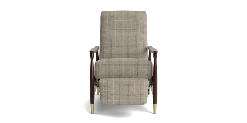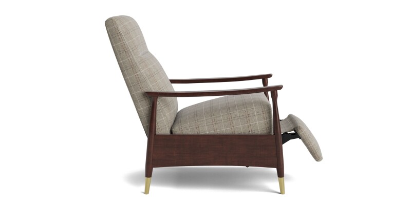 Vintage-modern manual recliner with lightly shaped wood arms and fabric upholstery. Tucked-away reclining keeps a clean look; customizable upholstery and wood finishes available.