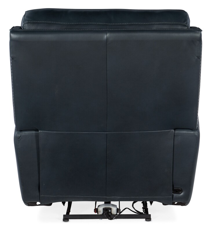 The modern silhouette of the Ruthe Zero Gravity Power Recliner has vintage inspiration, including the fresh twist on a wing chair profile and traditional pewter nailhead trim. Featuring a casual bustle-style back, power headrest and a USB port, the Ruthe is covered in the Salvo Denim semi-aniline top-grain leather.