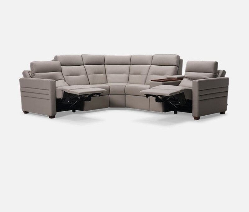 Reece begins with a transitional narrow track arm with heavily padded inside and outside panels. The outside arm panels have been further enhanced with two horizontal channels. The seat and backs mirror the track arm with box border styling and the backs include a decorative pull tuck detail and sits atop tapered solid walnut block legs. Reece comes standard with triple motor functionality; power footrest, power headrest and power lumbar. Please note the Palliser Recline app is required to access full recline functionality and additional premium features on armless pieces.